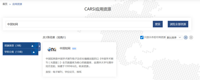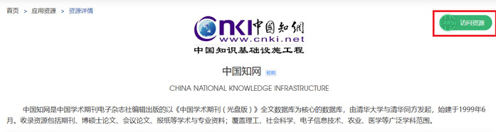 2.点击搜索页面右上角“访问资源”,进入中国知网(CNKI)网站(右上角显示我校名称),即可在线检索、浏览、下载使用我校订购的中国知网学术资源。