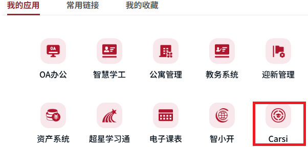 1.打开学校官网网站,点击首页右上角“信息门户”,登录统一身份认证平台,点击“我的应用—Carsi”,进入“CARSI应用资源”,搜索“中国知网”。